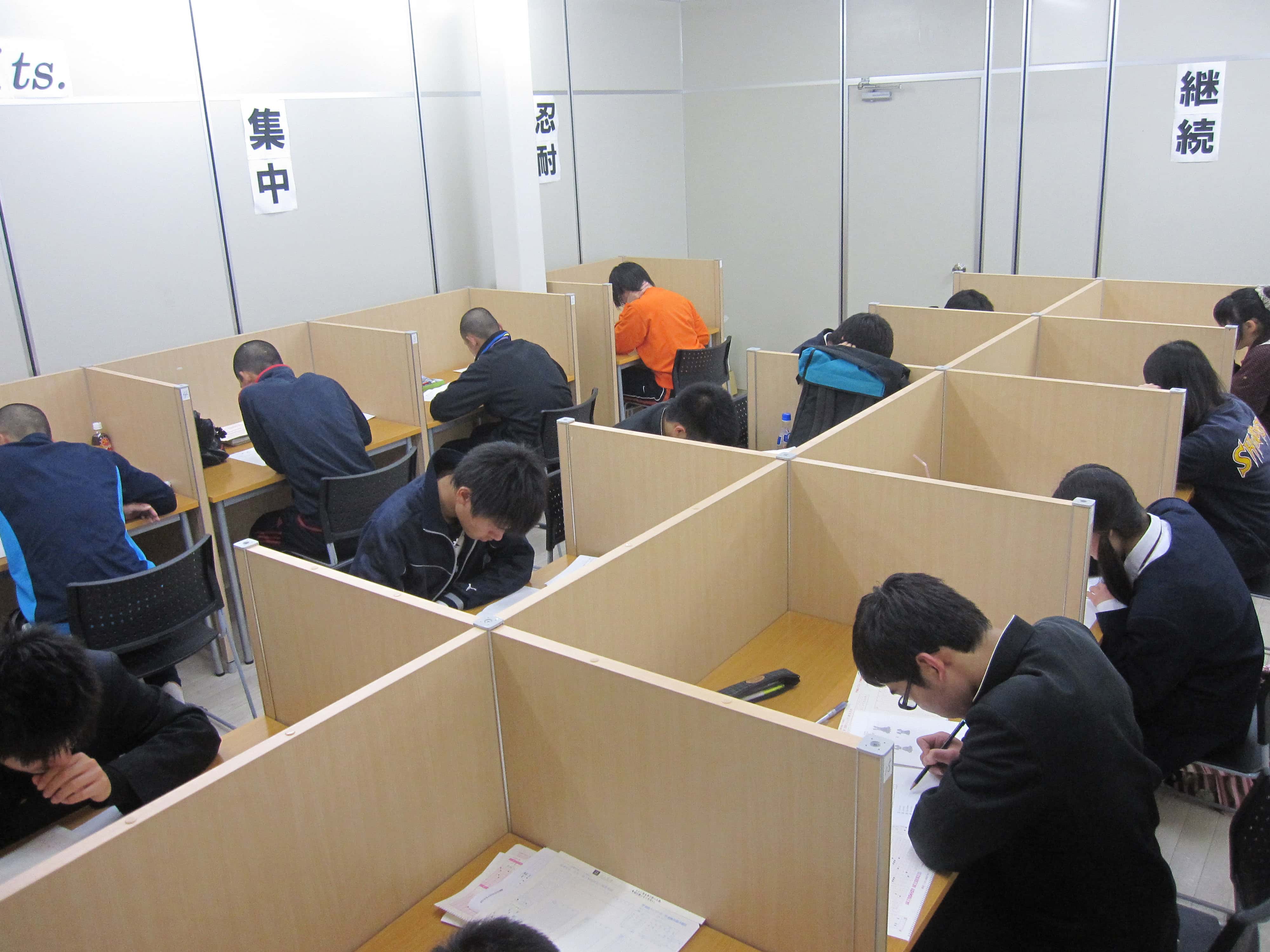 「家では集中できない」「友だちがいるから頑張れる」。学習量を確保することが成績向上には欠かせません。来塾日数と塾での滞在時間は成績向上に比例します。もちろんいつでも質問が可能です。 高校生専用の自習室では、毎日学校終了後から真剣な眼差しで自分と戦っている姿があります。