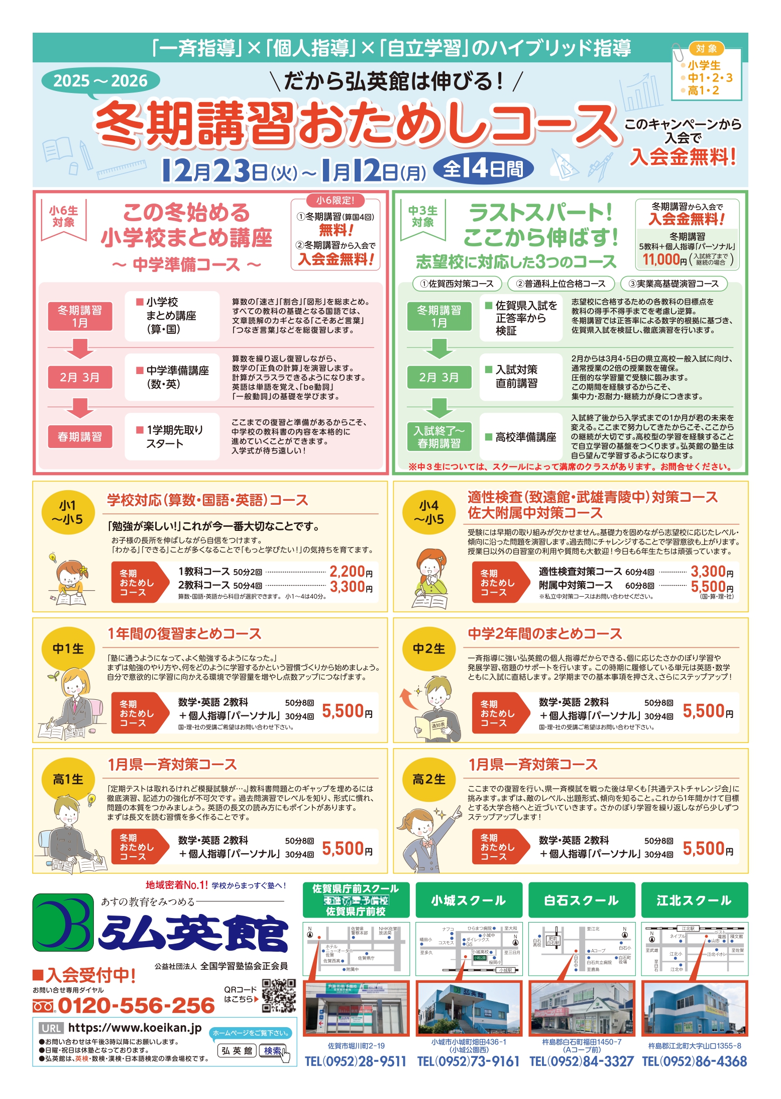 【中3生対象】冬期講習からのご入会で入会金が無料! 志望校に対応した3つのコース- 佐賀西対策コース